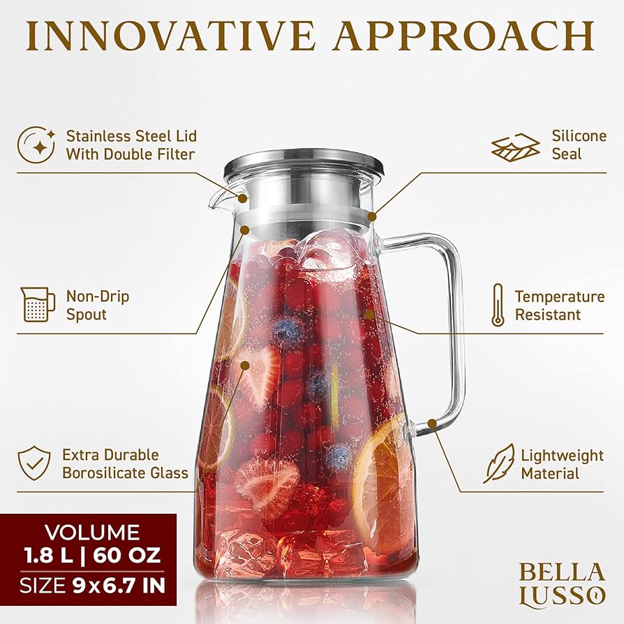Amazon Com Glass Pitcher 68oz Water Pitcher With Lid And Precise Scale Line 18 8 Stainless Steel Iced Tea Pitcher Easy Clean Heat Resistant Borosilicate Glass Jug For Juice Milk Cold Or Hot Beverages
